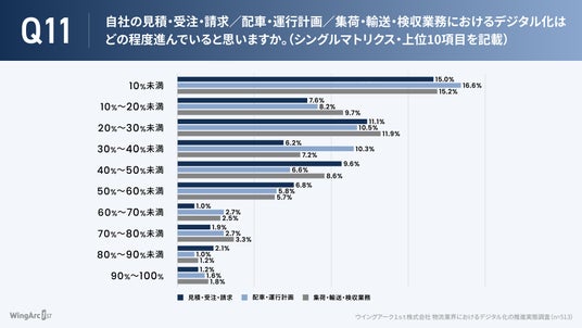 「Q11.自社の見積・受注・請求/配車・運行計画/集荷・輸送・検収業務におけるデジタル化はどの程度進んでいると思いますか。(シングルマトリクス)」(n=513)と質問したところ、見積・受注・請求は「10%未満」が15.0%、配車・運行計画は「10%未満」が16.6%、集荷・輸送・検収業務は「10%未満」が15.2%という回答となりました。