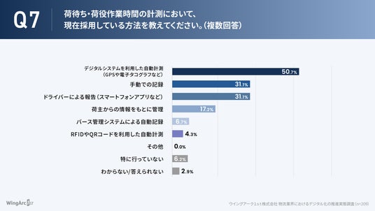 Q6で「完全に可視化されている」「一部のみ可視化されている」と回答した方に、「Q7.荷待ち・荷役作業時間の計測において、現在採用している方法を教えてください。(複数回答)」(n=209)と質問したところ、「デジタルシステムを利用した自動計測(GPSや電子タコグラフなど)」が50.7%、「手動での記録」が31.1%、「ドライバーによる報告(スマートフォンアプリなど)」が31.1%という回答となりました。