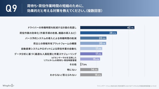 「Q9.荷待ち・荷役作業時間の短縮のために、効果的だと考える対策を教えてください。(複数回答)」(n=513)と質問したところ、「ドライバーの待機時間を削減する計画の見直し」が42.1%、「荷役作業の効率化(作業手順の改善、機器の導入など)」が28.5%、「バース予約システムの導入による待機時間の削減」が20.3%という回答となりました。