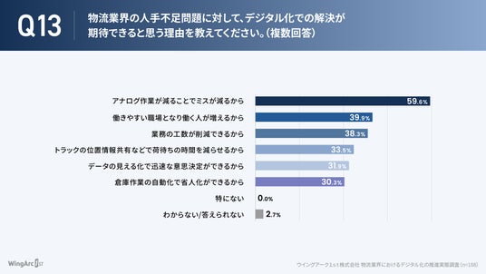 Q12で「非常に期待できる」「やや期待できる」と回答した方に、「Q13.物流業界の人手不足問題に対して、デジタル化での解決が期待できると思う理由を教えてください。(複数回答)」(n=188)と質問したところ、「アナログ作業が減ることでミスが減るから」が59.6%、「働きやすい職場となり働く人が増えるから」が39.9%、「業務の工数が削減できるから」が38.3%という回答となりました。