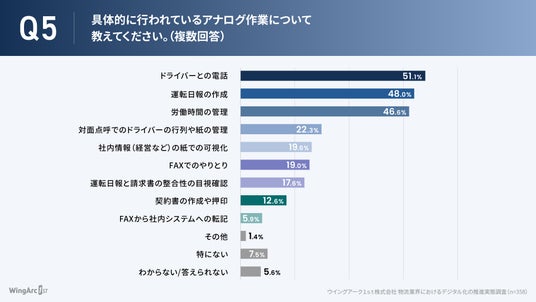 Q1、Q2、Q3のいずれかで「人手不足・人員体制」と回答した方に、「Q5.具体的に行われているアナログ作業について教えてください。(複数回答)」(n=358)と質問したところ、「ドライバーとの電話」が51.1%、「運転日報の作成」が48.0%、「労働時間の管理」が46.6%という回答となりました。