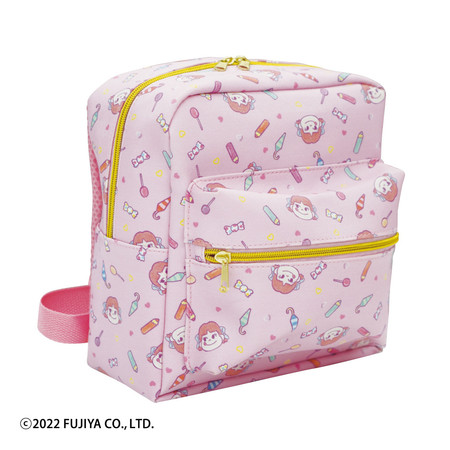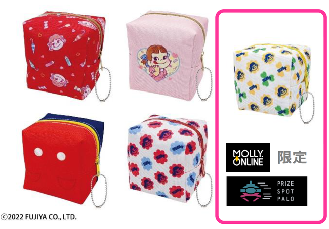 描き下ろしイラストやミルキーのデザイン、ペコちゃんのオーバーオールデザインのキューブポーチ
