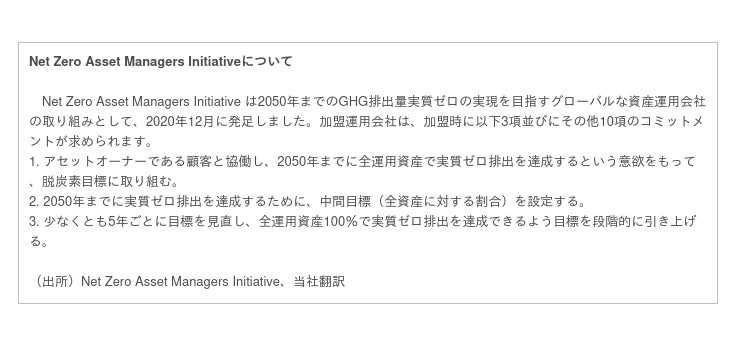 三井住友DSアセットマネジメント株式会社(代表取締役社長 兼 CEO:猿田 隆、以下「当社」)は、2050年までの温室効果ガス(以下、「GHG」)排出量実質ゼロの達成に向けた国際社会の取り組みに賛同し、同目標の実現を目指すグローバルな資産運用会社によるイニシアティブであるNet Zero Asset Managers Initiativeに加盟しております。