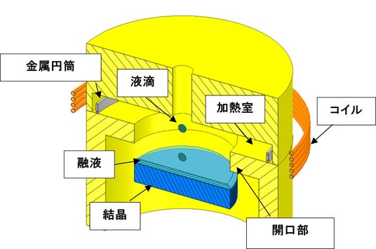 誘導加熱※3により金属円筒を加熱し、加熱室内の温度を上昇させます。それにより、結晶(種結晶)の表面が加熱室の開口部からの輻射で加熱溶融されます。この開口部の形状により、結晶表面の温度分布制御が容易になり、結晶径に合わせた最適な温度分布が実現しやすく大口径化が可能になります。原料融液を液滴で結晶表面に連続的に供給しながら結晶を下降させることで、結晶育成が進行します(図2)。