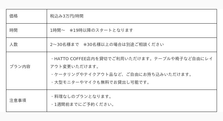 お電話(03-6910-5757)、またはメール(hatto-coffee@plazacreate.co.jp)にてご予約を承っております。開催予定日の1週間前までにご予約をお願いいたします。