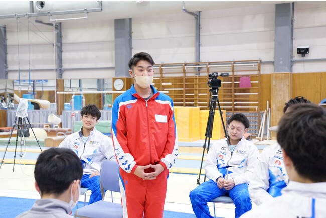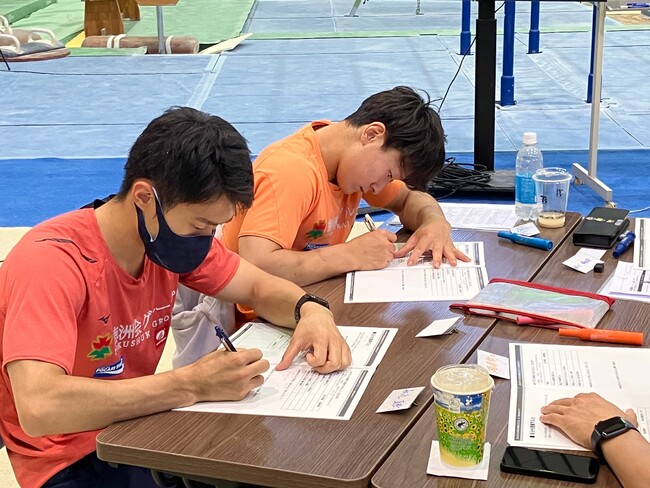 そんな米田監督がこだわる「考え方」の教育を、2015年からアチーブメント株式会社が支援しています。アチーブメント株式会社は創業から35年間・47万名の方に提供してきた教育メソッドをもとに、「勝つ目的」を明確化する研修を毎年実施し、今年で9年目になります。年2日間のこの研修の時間が、選手一人ひとりが自分を支える「考え方」を磨いていく時間であり、チームの根幹を見つめ、そして固め直していく時間なのです。ワークショップや、体験型のコンテンツを通じて、選手一人ひとりが「なぜ体操をするのか?」「なぜ勝ちたいのか?」「どんな選手になりたいのか」を深く考え、落とし込み、全員に伝えていきます。