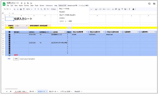 「伝票入力シート」は、Googleスプレッドシートに伝票データを入力し、API経由で伝票を簡単に登録できる機能です。伝票入力画面を使用せずにスピーディーに伝票登録が可能です。