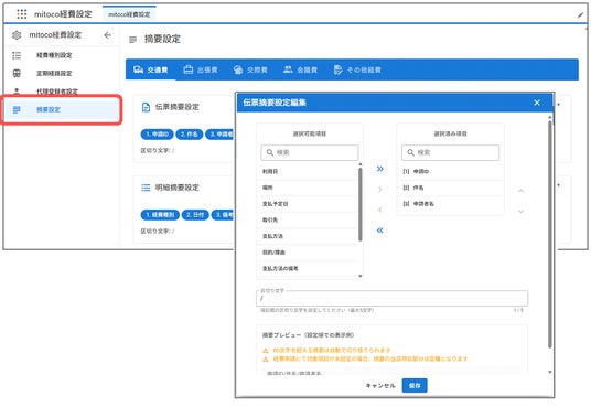 mitoco経費の設定画面から申請種別ごとに伝票摘要、明細摘要に設定する項目と区切り文字を管理することができます。