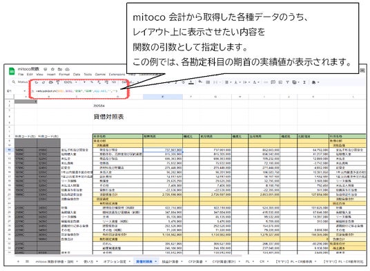 「mitoco 関数」は、Googleスプレッドシートに「mitoco 会計」の会計データを配置できる機能です。この関数を使って独自の帳票を作成することができます。