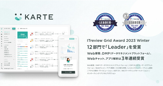株式会社プレイド(東京都中央区:代表取締役CEO 倉橋健太)の提供するCXプラットフォーム「KARTE」が、アイティクラウド株式会社(東京都港区:代表取締役社長 黒野源太)運営のIT製品レビュープラットフォーム「ITreview(アイティレビュー)」において満足度・認知度ともに優れた製品であると評価され、「ITreview Grid Award 2023 Winter」の12部門にて3期連続で「Leader」を受賞しました。
