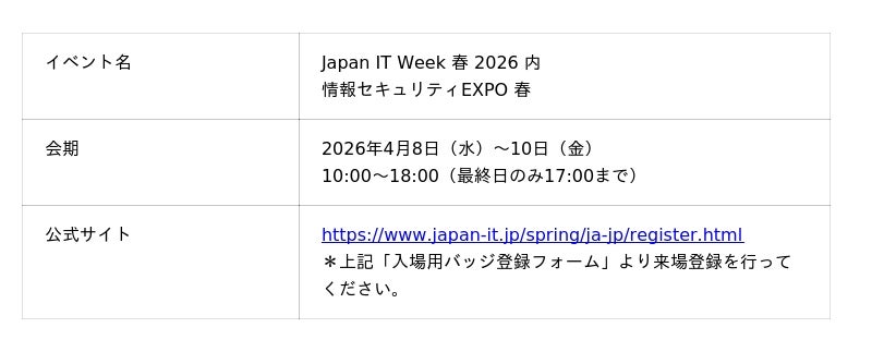 エムオーテックス株式会社(本社:大阪市淀川区、代表取締役社長:徳毛 博幸、以下MOTEX)は、2026年4月8日(水)~10日(金)に東京ビッグサイトで開催される日本最大級のIT展示会『Japan IT Week 春 2026』内の『情報セキュリティEXPO 春』に出展します。