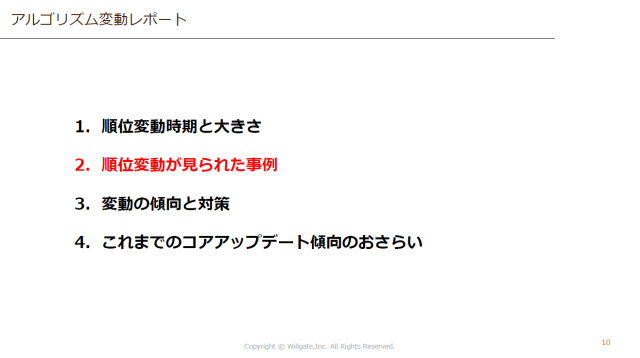 本資料では2023年8月23日~9月8日に展開された「August 2023 core update」に対して、ウィルゲートが観測しているキーワードやウェブサイトの順位変動の状況、順位が変化したページやメディアの事例を調べ、どのようなサイト変化あったのかの仮説を立て、調査報告しております。