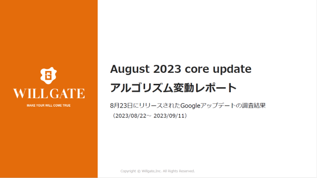 株式会社ウィルゲート(本社:東京都港区、代表取締役:小島 梨揮、以下「ウィルゲート」)は、2023年8月23日~9月8日にかけてリリースされたGoogleアルゴリズムアップデート「August 2023 core update」で自社サイトのSEO流入に影響を受けた企業にむけて、「アルゴリズム変動レポート」を無料公開しました。