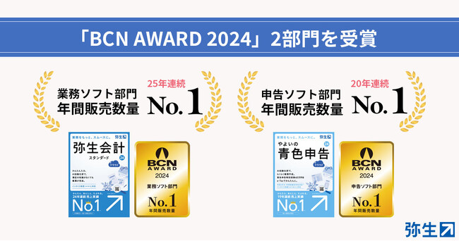 弥生株式会社(本社:東京都千代田区、代表取締役 社長執行役員:前山 貴弘、以下「弥生」)は、株式会社BCN(本社:東京都千代田区、代表取締役社長: 奥田 芳恵)が主催する「BCN AWARD 2024」において、25年連続で「業務ソフト部門」年間販売数量No.1、20年連続で「申告ソフト部門」年間販売数量No.1を受賞したことをお知らせします。