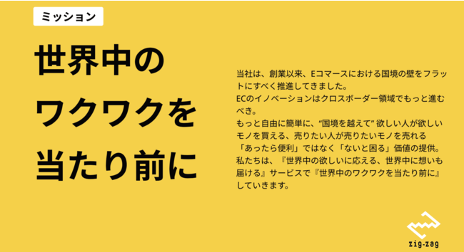 日本中のECサイト(ショップ)をウェブインバウンド(R)対応する。様々な越境ECサービスがある中で、当社は、数100万サイトあるだろうオウンドECサイトを海外対応することが最も海外にファンを増やすために大事だと思っています。だから私たちジグザグの役割は、海外生活者と日本のECサイトを気持ちよく繋ぐことになります。これを8期目以降、より強化して日本のショップサクセスと海外のカスタマーサクセスを実現していきます。