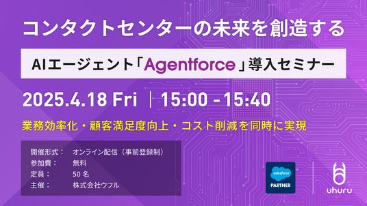 株式会社ウフル(本社:東京都港区、代表取締役社長:園田 崇史、以下ウフル)は、2025年4月18日(金)、Salesforceが提供するAIエージェントプラットフォーム「Agentforce(エージェントフォース)」の導入を検討する企業・団体を対象に、コンタクトセンター業務の課題解決をテーマとしたオンラインセミナーを開催いたします。