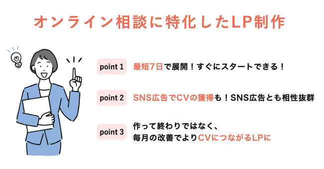 オンライン相談の打ち出しにより、お客様に対して情勢に合わせたご提案が可能となり、イメージしていただきやすいLP制作とSNS広告のご提案をさせていただきます。
