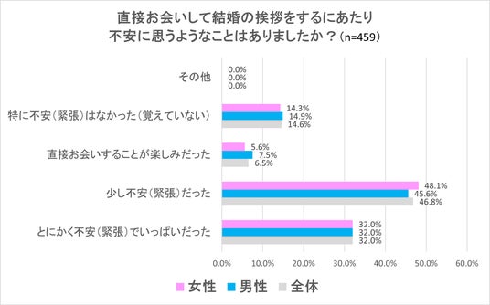 全体の32.0%は「とにかく不安(緊張)でいっぱいだった」という結果で、男女とも全く同数の回答割合となりました。3人に一人は不安と緊張でいっぱいの状況でお相手の両親へのご挨拶をむかえていることが調査結果からうかがえます。また、全体の46.8%は、いっぱいではなかったものの、少なからずは不安や緊張を抱えてお相手の両親への挨拶を迎える状況であったということで、「いっぱいだった」(32.0%)と「少し不安だった」(46.8%)をあわせて「全体で78.8%が不安や緊張感を持つものが結婚前のご両親への結婚の挨拶」いうことが言えるのではないでしょうか。