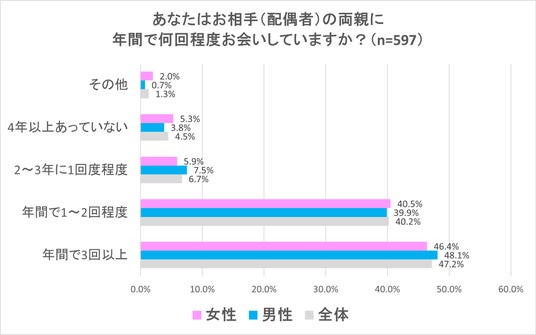 最も多い回答は「年間で3回以上」で全体の47.2%、「年間で1~2回程度」が40.2%という回答結果となり、あわせて87.4%が「年間で1回以上」お相手の両親にお会いしているという結果となりました。居住地と実家との距離やその他の個別の事情がある場合を除いて、20代後半~30代前半の既婚男女がお相手の両親にお会いししているということは、いいかえると夫婦間で双方の実家への訪問の調整やお会いする機会を相談して対応しているということもうかがえる結果となりました。