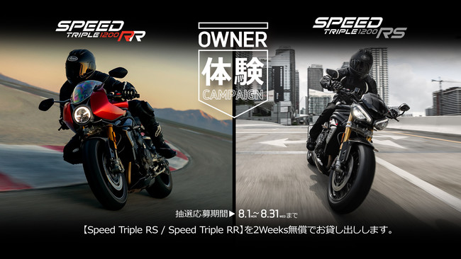 トライアンフモーターサイクルズジャパン株式会社(代表取締役:大貫陽介、東京都港区)は8/1から8/31までの期間中、「Owner体験キャンペーン」にご応募頂いた方から抽選で【2名】様に、【Speed Triple 1200 RS/ Speed Triple 1200 RR】のそれぞれ1台を抽選で1名様(合計2名)に、2週間お貸し出しするキャンペーンを実施することをお伝えします。