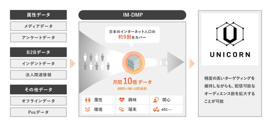 このたびの連携により、UNICORNは「IM-DMP」が保有する膨大なデータソースを活用したターゲティング配信が可能となります。これまでUNICORNが蓄積してきた運用データ、配信最適化のノウハウを掛け合わせることで、配信可能なオーディエンス数を拡大しながら、生活者の行動や関心を捉えたターゲティング配信を提供します。