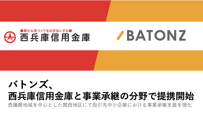 M&A総合支援プラットフォーム「BATONZ(バトンズ)」を運営する株式会社バトンズ(本社:東京都中央区、代表取締役CEO:神瀬 悠一、以下バトンズ)は、西兵庫信用金庫(本社:兵庫県宍粟市、理事長:桑垣 喜一)と中小企業における第三者承継・M&Aを支援するための提携を開始したことをお知らせします。