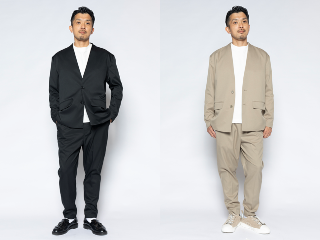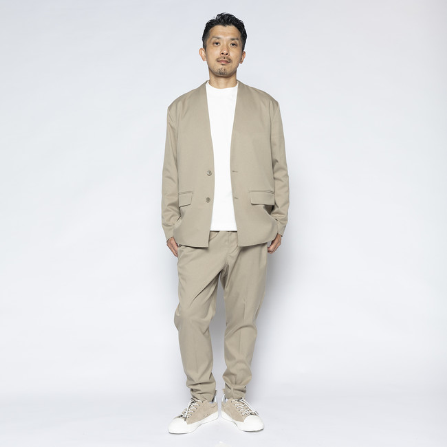「ノーカラージャケット」は、既存のジャケットと比較して身幅や肩幅にゆとりを持たせたサイズ感に仕上げ、カーディガンのようにゆったりと楽に羽織ることができます。「テーパードイージーパンツ」は、スニーカーやサンダルなどに合わせやすいアンクル丈で、程良いテーパードシルエットとセンタープレスで単体でもキレイめに着用できるデザインにしました。ウエスト総ゴムのイージーパンツで、ドローコードも備えているのでウエストの調節も可能です。