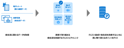 朝食の摂取や苦手食材の克服など、食生活の改善を促すクエストの提供を通じ、食生活の改善効果を検証します。また、家族で取り組むことによるシナジー効果の有無も検証します。