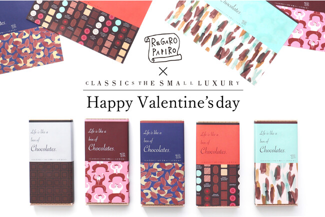バレンタインギフトに、毎年人気の板チョコ仕様の限定ラッピング。今年は、全5柄の中で3柄は、ラッピングペーパー専門店「REGARO PAPIRO(レガーロパピロ)」がオリジナルで手掛けている包装紙とのコラボレーションデザインが登場します。シックな「アーモンドとカシューナッツ」、「ブラッシュハート」と、日頃がんばっているお父さんへ感謝を込めて、ぜひとも贈っていただきたい「がんばる父さん」をモチーフにしたデザインです。