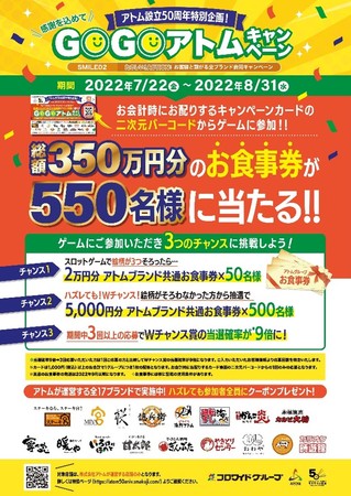 コロワイドグループの株式会社アトム(本社:神奈川県横浜市、代表取締役社長:山角豪)は、アトムが運営する全17ブランド343店舗にて、2022年7月22日(金)~8月31日(水)の期間中総額350万円分のお食事券が550名様に当たる