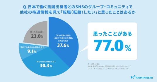 日本で働く自国出身の外国人とのSNSのグループ・コミュニティに参加しているか質問したところ、60.4%が参加していることが明らかになりました。またそのうち、そのコミュニティで他社の給与もしくは働き方に関する情報を見て転職したいと思ったことがある回答者は合計77.0%にも上り、「両方を見て、そう思ったことがある」(37.6%)が最も多く、次いで「『給与・賃金の情報』を見て、そう思ったことがある」(30.3%)、「『会社での働き方の情報』を見て、そう思ったことがある」(9.1%)となりました。