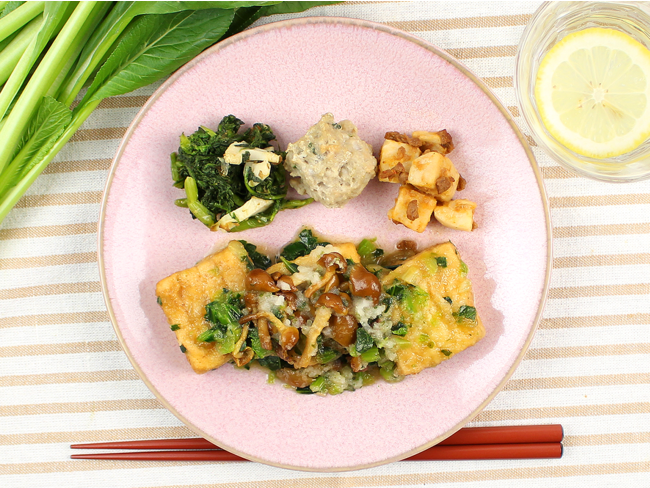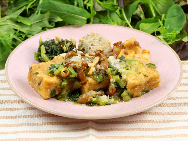 大豆の濃厚な風味の絹ごし豆腐を使用した揚げ出し豆腐です。口当たりなめらかな食感の揚げ出し豆腐に国産のなめこ、青のりを混ぜた大根おろしをのせております。風味豊かなかつおだしに生姜醤油を合わせ、あっさりとお召し上がりいただけます。