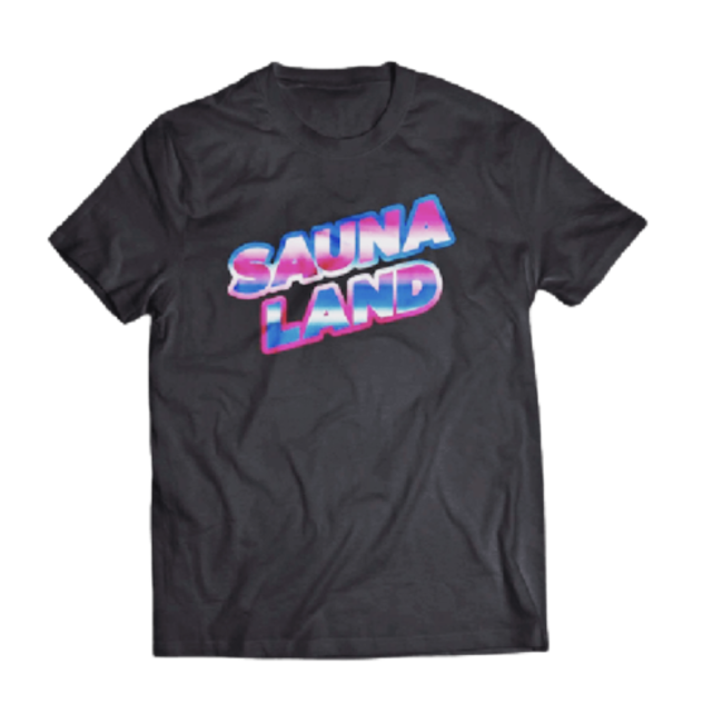 黒地に「SAUNA LAND」のノスタルジーなロゴがプリントされたシンプルなTシャツです。