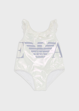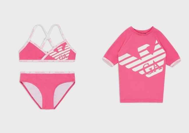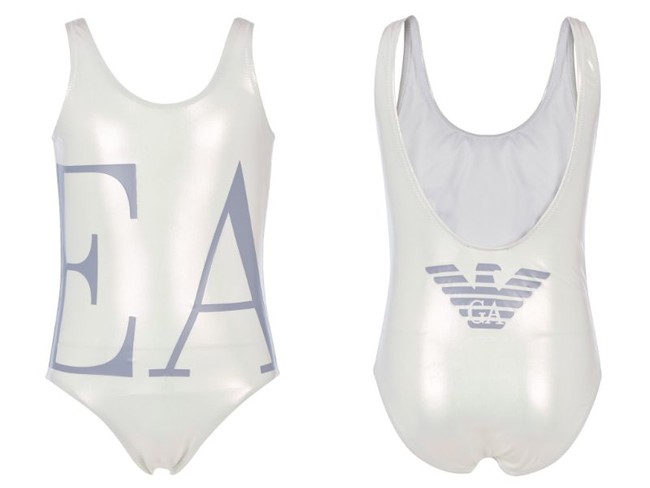 ガールズ用水着として登場するのは2型。(それぞれ4歳、6歳、8歳、10歳、12歳、14歳用の6サイズ展開)ワンピースタイプは、メタリックホワイトのカラーリングが都会的な1着。フロントには大きくブランドの頭文字「EA」の文字、バックにはブランドアイコンのイーグルロゴが輝きます。