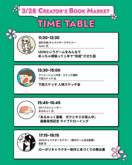 初心者の方でも参加可能な下田スケッチ氏のスケッチ会、人気イラストレーター・あるみっく氏によるライブドローイング、Yoshi.氏による『IZON.』トーク、「ローポリで極めるキャラクターモデリング」の著者・高部氏による書籍紹介など、多様な内容をお届けします。