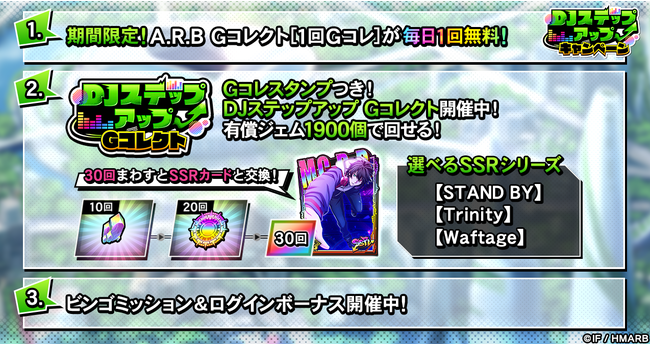 期間中A.R.B Gコレクトの[1回Gコレ]を1日1回、無料で回すことができるほかに、ビンゴミッションやログインボーナス、オートプレイ1日2回消費無料キャンペーンなどを開催しています。詳細はアプリ内お知らせをご確認ください。