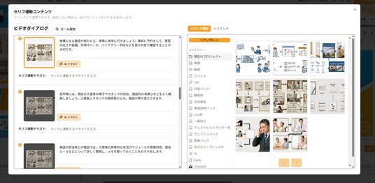 「セリフ連動コンテンツ」は、動画内のセリフ(ナレーション原稿の行)ごとに、表示するコンテンツ(ここでは“画像・動画素材”)を紐づける機能です。
