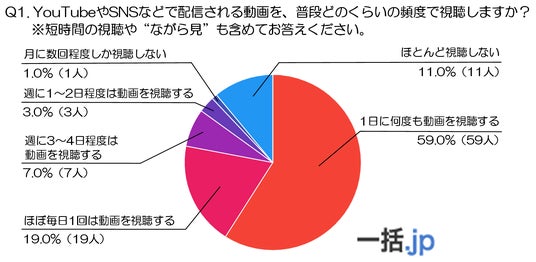 - 最も多かったのは「1日に何度も動画を視聴する」と回答した人で、全体の59.0%(59人)を占め、動画視聴が生活の一部として強く定着している様子が見られます。