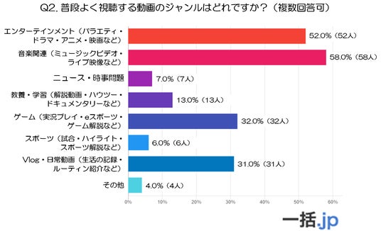 - 最も多かったのは「音楽関連(ミュージックビデオ・ライブ映像など)」で、58.0%(58人)が選択しており、日常的に音楽を楽しむ習慣が根強いことがうかがえます。