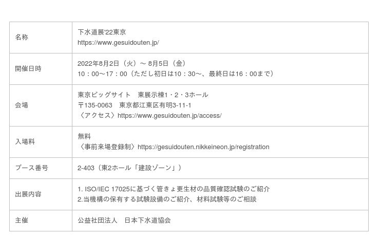 一般財団法人日本品質保証機構(本部:東京都千代田区、理事長:小林 憲明)は、2022年8月2日(火)~5日(金)に東京ビッグサイトにて開催されます「下水道展’22東京」に出展いたします。