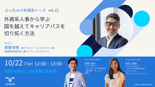 総合人材サービスを提供するランスタッド株式会社(本社:東京都千代田区 代表取締役社長 猿谷哲)は、10月22日(火)に「ぶっちゃけ外資系トーク」と題し、ソーシャルメディアX(旧Twitter)スペースにてライブ配信を行います。ネスレ日本株式会社リージョナルタレントアクイジションの和田真知氏とランスタッドの人事本部タレント部長の西野雄介がファシリテーターとして出演し、毎月外資系企業での働き方について語り合うオンラインイベントです。15回目となる今回は英グラクソ・スミスクラインの新興国地域担当人事バイス・プレジデント 屋鋪 智樹氏をお迎えし、「外資系人事から学ぶ、国を越えてキャリアパスを切り拓く方法」をテーマにお話します。日系製薬会社やスイスの食品メーカー、米国の大手ヘルスケアや米系医療機器・医薬品会社における国際的人事経験を持つ屋鋪氏と共に、国境を越えてキャリアパスを切り拓く方法についてお話します。外資系企業への転職を検討されている方や転職活動中の方をはじめ、外資系に関心のあるビジネスパーソンがランチタイムに気軽に参加いただけるイベントです。