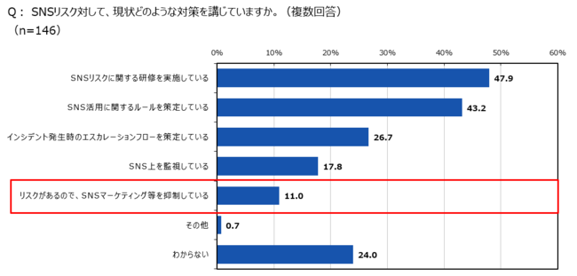 SNSリスクを抑制するためには、従業員への研修、ルール策定による未然に防ぐ活動や、インシデント発生時のエスカレーションフローの構築やSNS上の監視によるダメージの最小化の取り組みを行っている企業がある一方で、「リスクがあるので、SNSマーケティング等を抑制している」と答えた企業が11%存在。
