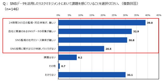 「24時間365日の監視・対応体制が、難しい」、「自社に関連のあるSNSデータの収集が難しい」、「SNS監視の社内リソース確保が難しい」、「SNS投稿に関するリスク判断ノウハウがない」への課題を挙げる企業も存在し、現行のリスクマネジメントの体制に改善の余地があることが浮き彫りになった。