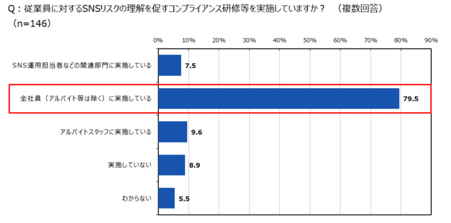 1,000名以上の従業員を抱える大企業の79.5%が、従業員に対するSNSリスクの理解を促すコンプライアンス研修を「全社員(アルバイト等は除く)に実施している」と回答。