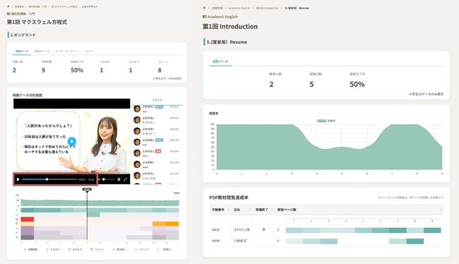 また、動画コンテンツに関する学生の行動データは管理画面にヒートマップとして表示され、学生のアクション量の相対的な多寡・濃淡を視覚的に分かりやすく把握できます。これにより「動画のどの時点で学生の反応が多かったのか」という細かい分析が可能になり、授業の改善ポイントの特定から大学全体の学びの質向上に寄与します。