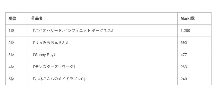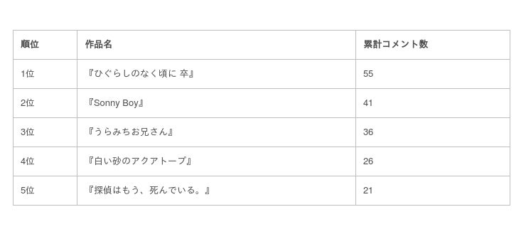 株式会社つみき(代表取締役社長:鈴木貴幸、本社:東京都目黒区)が運営する国内最大級の映画やドラマ、アニメのレビューサービス「Filmarks(フィルマークス)」は、サービス内のデータに基づいた「2021年夏アニメ ランキング」の中間集計結果を発表いたしました。