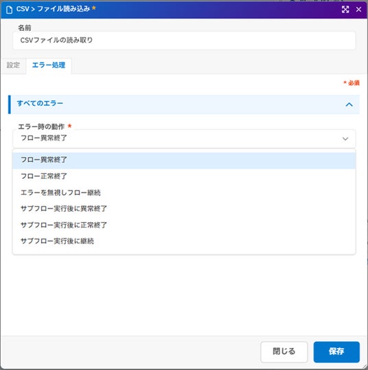 フロー上に配置したアイテムごとに、エラー発生時の動作を指定する、エラー処理機能を追加しました。