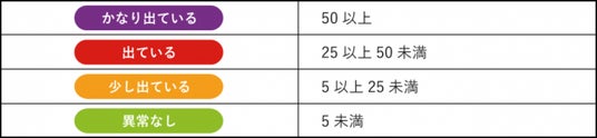凡例は下表のとおりで、お住まいの地域の指数が25以上の場合は、シロアリ被害のお問い合わせが相次いで発生している状況です。