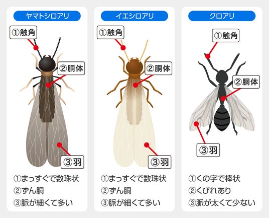 羽アリにも種類があり、これからの時期特に気をつけたいヤマトシロアリの羽アリは、全体的に黒っぽくくびれのないずん胴の胴体が特徴です。