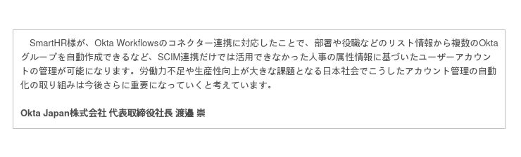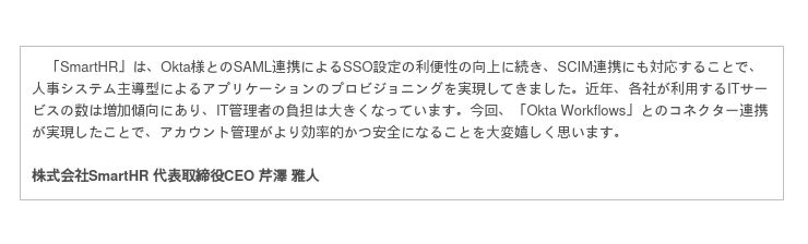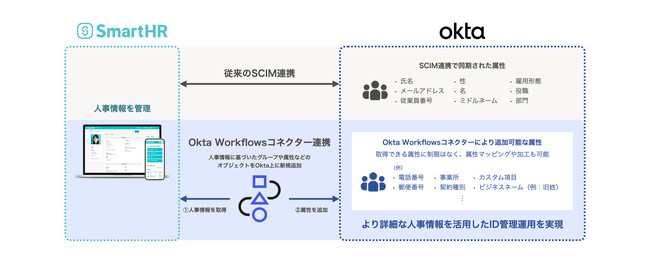 株式会社SmartHR(本社:東京都港区、代表取締役CEO:芹澤 雅人)が運営するクラウド人事労務ソフト「SmartHR(スマートエイチアール)」は、Okta Japan株式会社(本社: 東京都渋谷区、代表取締役社長:渡邉 崇)が運営するノーコードでID管理におけるビジネスプロセスの自動化を行う「Okta Workflows」と、コネクター連携を開始しました。「Okta Workflows」がHRのシステムとコネクター連携するのは「SmartHR」が初めてとなり、「SmartHR」は「Okta Workflows」のプレビルドされたコネクターを通じて、より詳細な人事情報を活用したID管理運用を容易に実現します。
